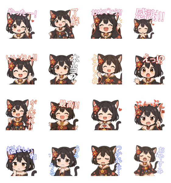 和風で元気いっぱいの猫娘スタンプ! 挨拶や感情、お祝いメッセージが満載で、毎日のトークにぴったり。 かわいい、猫、アニメ、女の子、日本風、素敵な魅力がいっぱい!