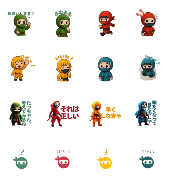 | スタンプ説明 | akano studio のマーダーミステリー『カラフル忍者と禁断の巻物』のスタンプ。緑忍者は2歳の天才、青忍者は引退済みお爺さん、赤忍者はリーダー、黄忍者は走り早い小学生。 |