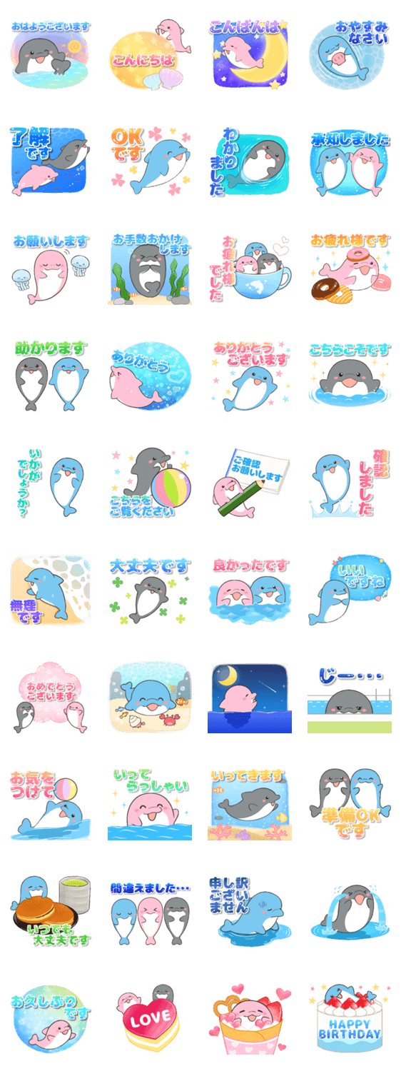 日々を満喫するイルカたち。毎日使える挨拶やお礼等の日常会話から誕生日のお祝い等にも。敬語多め。