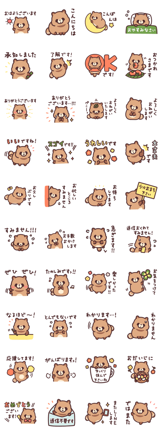 のんびりたぬきの敬語スタンプがでました!丁寧なことばのあいさつや気づかい、お誘いなど、ゆるい敬語で毎日使える内容です。