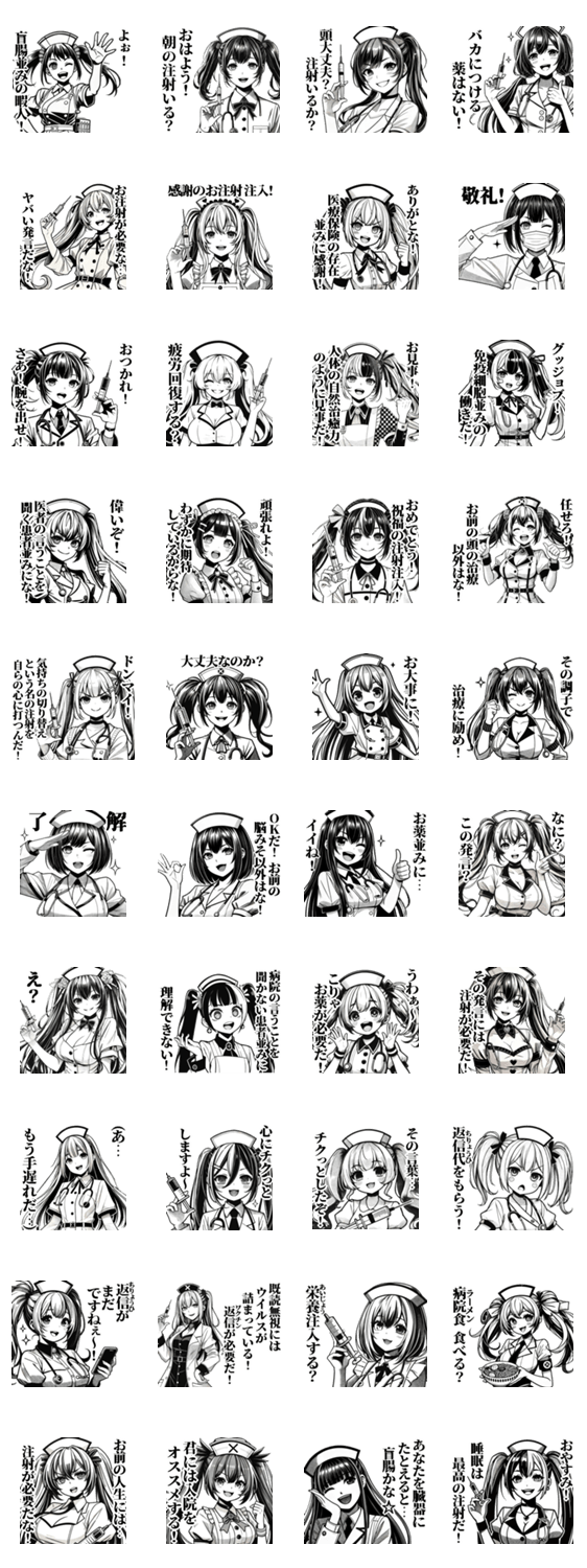 なんかウザい感じのナースさんのスタンプです。健やかな毎日を。このお注射は全部ビタミンです。コスプレ、看護師さん、看護婦さん、医療、病院、病気、健康、お薬、煽り。