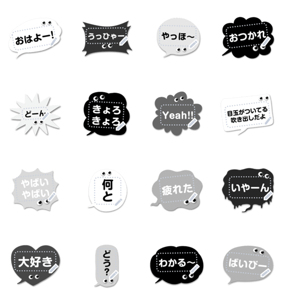 自由に文章を書き込むことができる便利な吹き出しセット♡ キョロキョロゆるかわいい目玉のシールが付いてる使いやすいモノクロのメッセージスタンプです♪ 現在この商品は一部のスマートフォン版LINE 10.3.0以上のトークルームでのみ使用できます。動作環境の最新情報はヘルプをご確認ください。