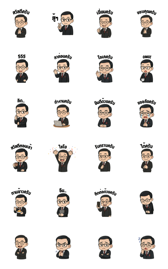 Chibi style stickers of an older man in a suit showing 24 cute emotions and actions perfect for chats, work, and everyday expression.