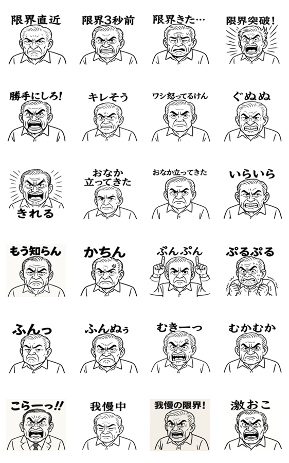 怒りの表情バリエーション満載!叫ぶ、睨む、ムスッとする…“怒りおやじ”が表情であなたの感情を全部代弁!
