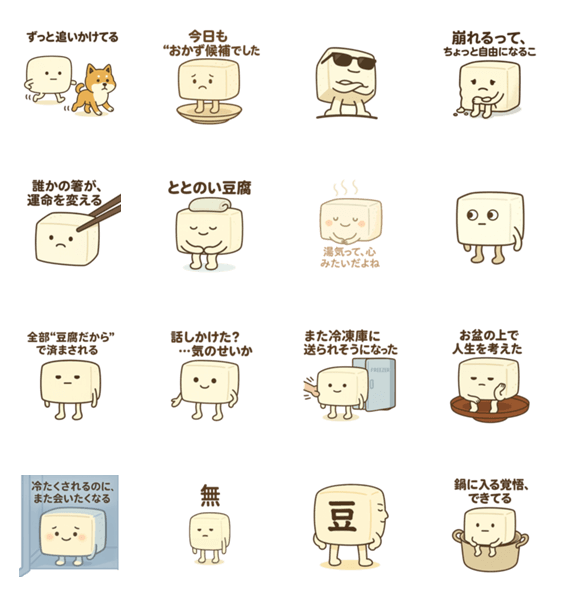 豆腐、再登場! 使いどころに困るような、でもなぜか共感できる、ちょっぴり不思議なスタンプたち。言葉にならない気持ちも、豆腐が代弁してくれます。