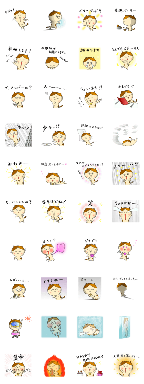 三毛猫が帰ってきました!ゆるゆるなおもしろポーズでネコらしさよりもキモカワ&女子力がパワーアップ!?日常会話で使えるスタンプ…だと思います!笑!よろしくね