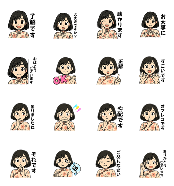 黒髪ショートヘアの女の子が、丁寧語でおしゃべりする使いやすいスタンプです。