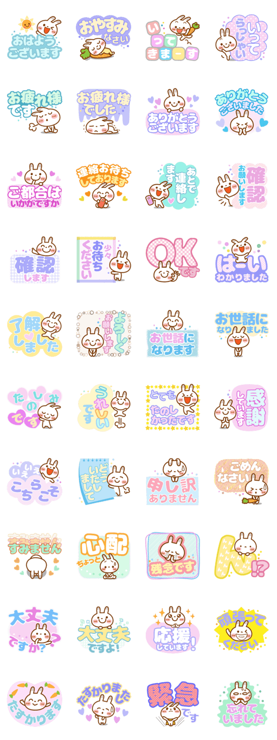 可愛いブチうさぎのスタンプです。誰もがよく使う敬語を可愛らしいカラーで見やすい大文字にしました。基本セットと併せて使ってくださいね!