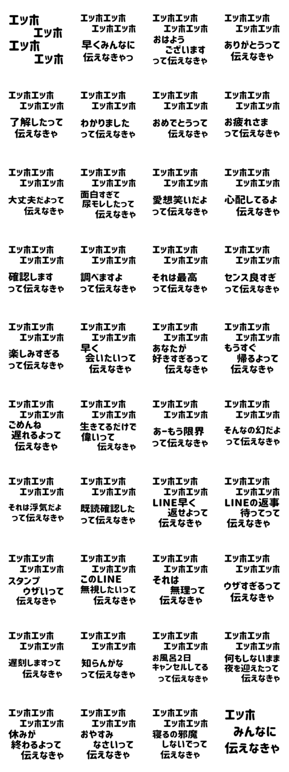 | スタンプ説明 | えっほえっほで毎日使いやすいセリフを伝えるスタンプ! 構文/40個/鬱/挨拶日常返信/面白い/文字だけ/白抜き/流行り/メンヘラ/ネットミーム/面白い/爆笑/彼氏彼女/ネタ/笑/ |