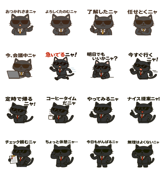 | スタンプ説明 | サングラスをかけた黒ネコ係長が、あなたの毎日のビジネス会話をサポート! クールだけどちょっとかわいい、使いやすい敬語スタンプです。 |