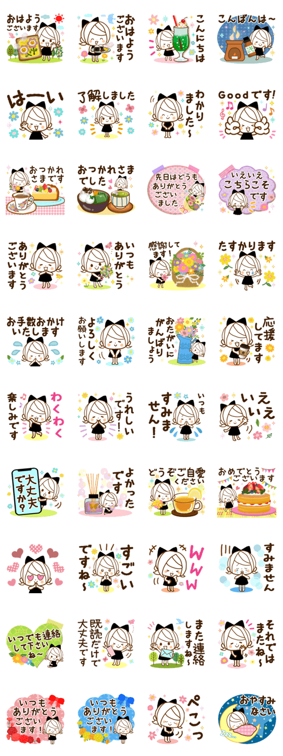 大きな黒いリボンのかわいい女の子の、使う相手を思いやる優しい日常敬語スタンプです♡1年中ず~っと使えます♪(ママ友/挨拶/仕事/お祝い/母の日/父の日/誕生日)