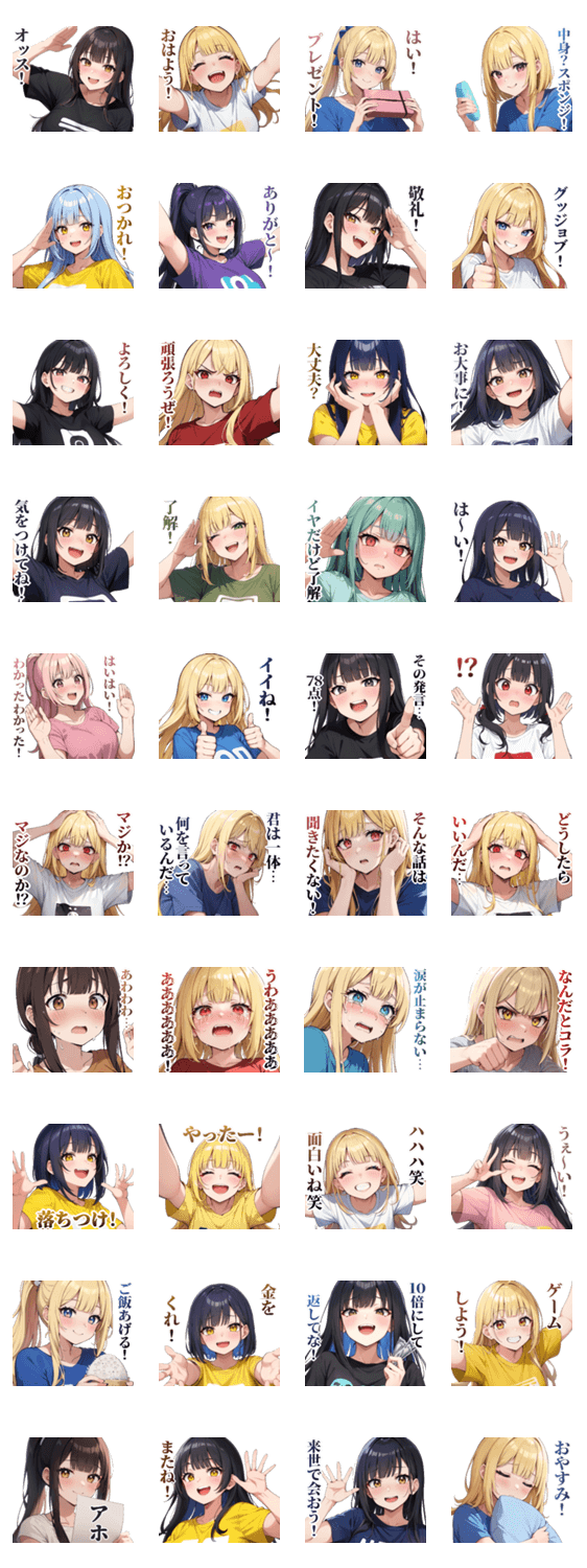 無難にカジュアルに毎日、一年中便利に使えるTシャツの女の子のスタンプです。日常会話や返信など毎日のお供にどうぞ。かわいい、可愛い、カワイイ、美少女、萌え、アニメ