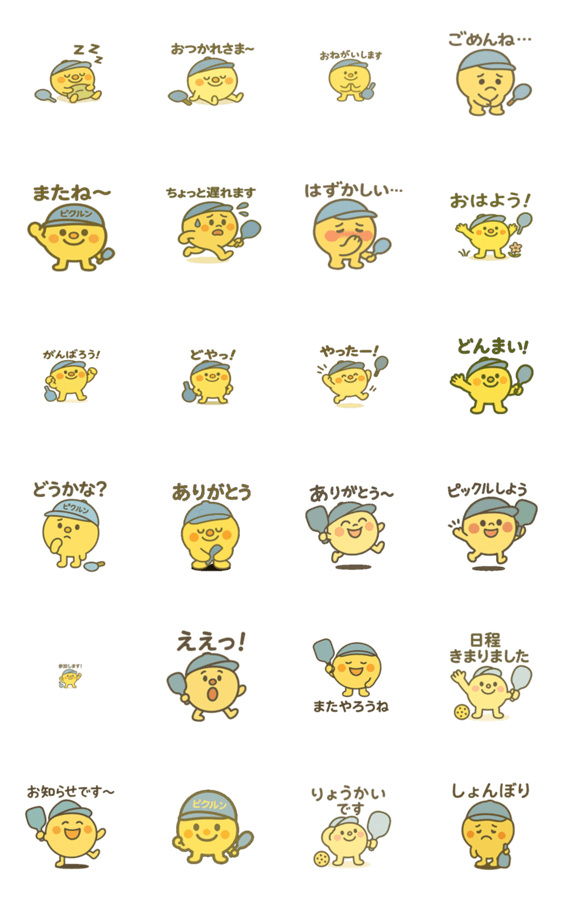 | スタンプ説明 | ピックル星からやってきたピクルン!ピックルボールのボールがモチーフだけど…あれ?穴がない!?ピックル星ではこれが常識。色んな表情でトークを盛り上げます! |