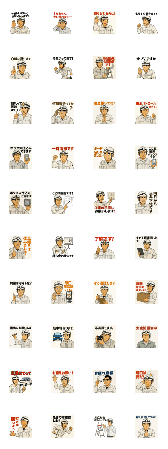 建設現場・工事現場・作業現場で大活躍! 「おはようございます」「今向かってます」など、現場でよく使うリアルなセリフを厳選。
