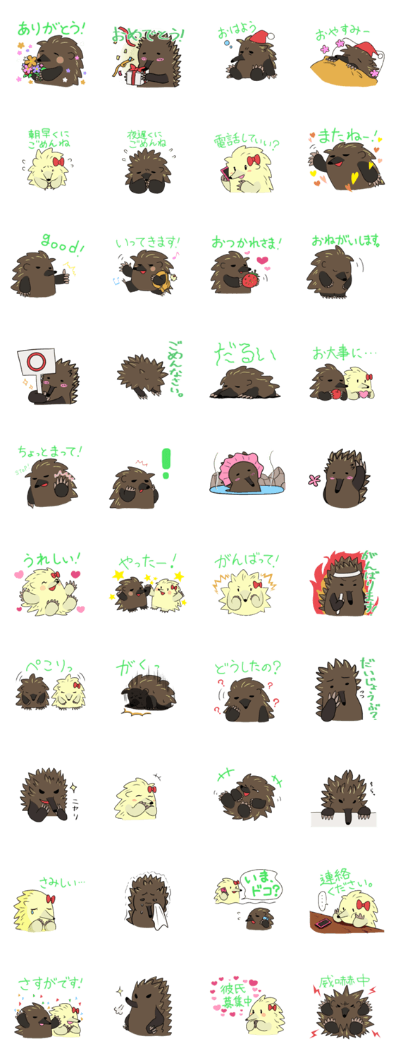 | スタンプ説明 | みんなのアイドル「ハリモグラ」がスタンプになったよ! 基本的な挨拶や日常的に使える言葉を選んで作ってみました。 製作担当 秋月 榎莫 コウゾウさん |