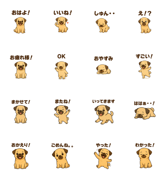 ふんわり表情豊かなパグがトークを盛り上げる16種類のスタンプセットです。おはよ!からおやすみまで、日常使いしやすいフレーズを集めました。