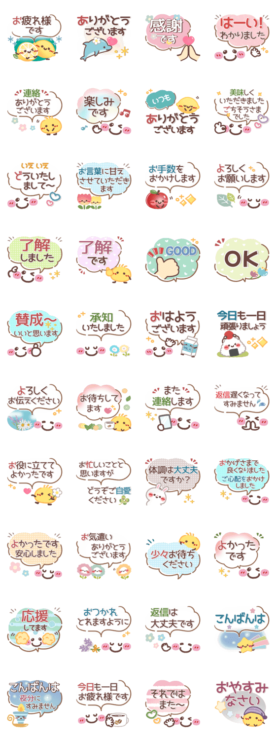 一回で気持ちが伝わる敬語スタンプです。挨拶/日常/気遣い/思いやり/吹き出し/食べ物