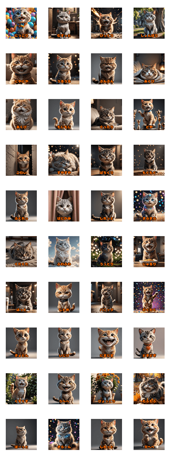 にっこり、むすっと、びっくり!表情豊かなアニメ猫たちが、あなたの気持ちをかわいく伝えます。毎日のトークにぴったり♪