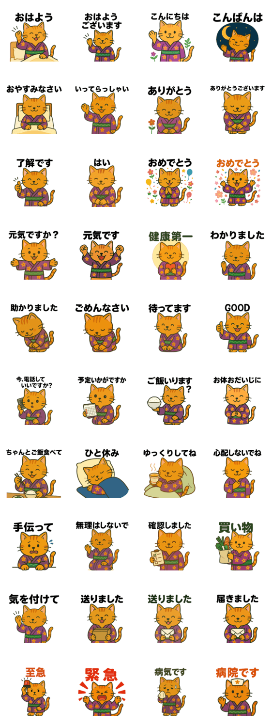 | スタンプ説明 | 文字が大きく見やすい、目が悪い方や文字入力が大変な方にもピッタリ!着物を着た穏やかなトラ猫が日常でよく使う言葉を優しく届けます。 |