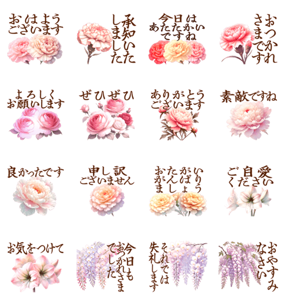カーネーション、バラ、アマリリス、芍薬、藤、マリーゴールドなど5月に咲く花が色鮮やかな敬語・気遣いの言葉の飛び出すスタンプ!シンプルで文字も大きく、使いやすさ◎