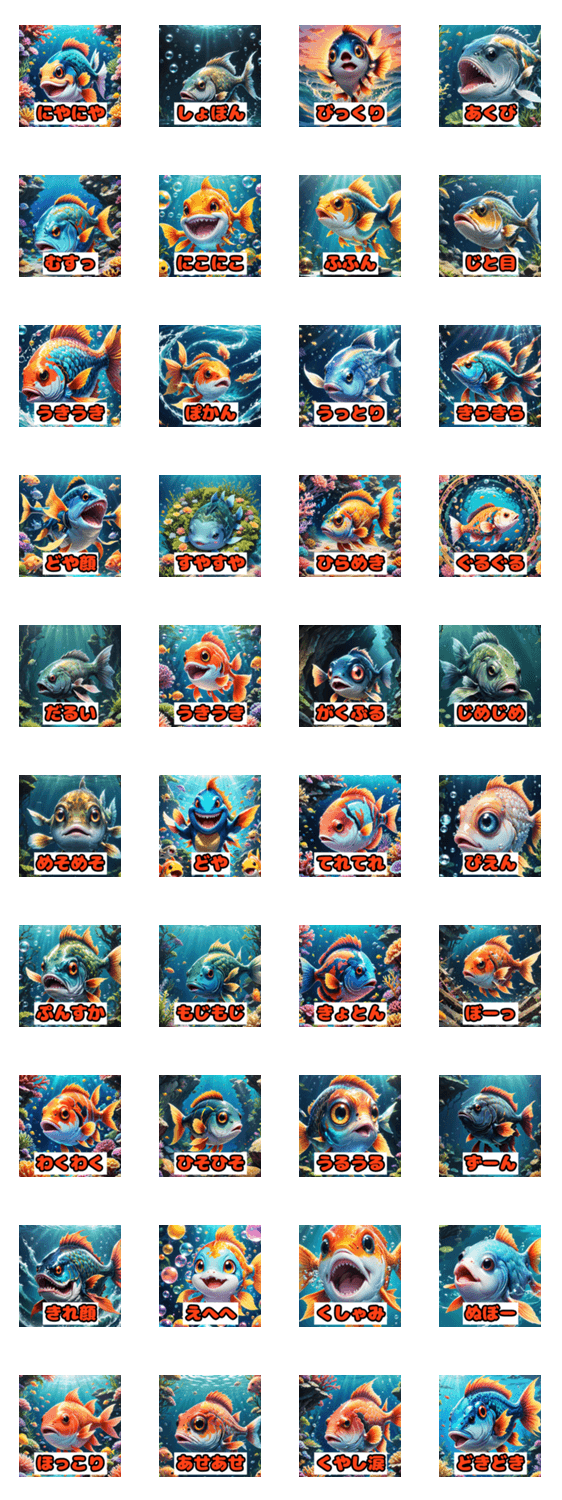 魚たちがにやり、しょんぼり、ぴえん…!? ゆる〜い表情の魚スタンプで、あなたの気持ちを個性的に伝えましょう!毎日使える40種。