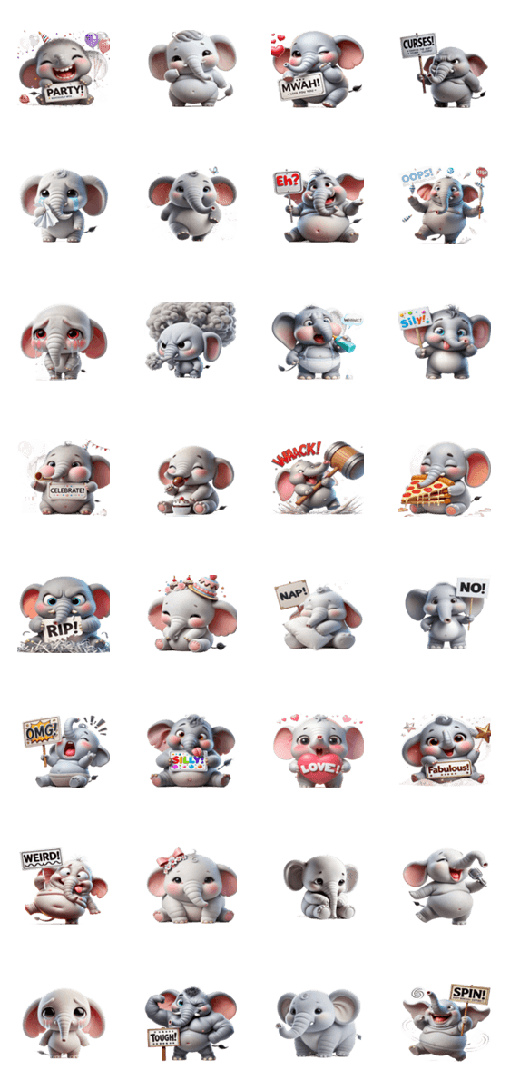 | スタンプ説明 | "小さなぽっちゃりゾウのおもしろスタンプ、まんまる、ユーモラス、お笑いスタイル、超かわいい、動物キャラ、面白い表情、LINEスタンプ、イラストスタイル、日常コ |