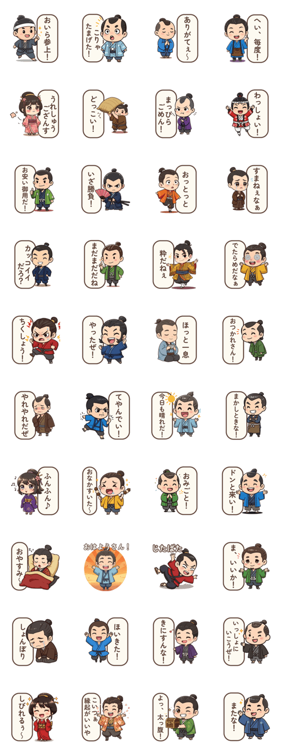 | スタンプ説明 | 江戸時代の町人をちびキャラ化!ちょんまげ頭と丸い体が愛らしい40種。粋で元気なポーズが日常トークを彩ります。 |
