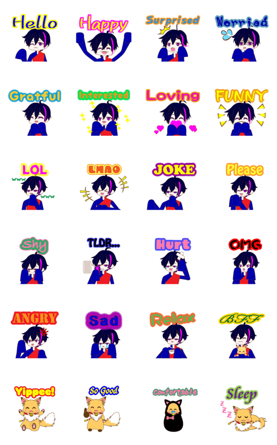 男の子と可愛い狐の英語とネットスラングで感情表現をしているLINEスタンプです 意味の説明がないので、分からない場合は調べて使ってください 不親切で申し訳ないです