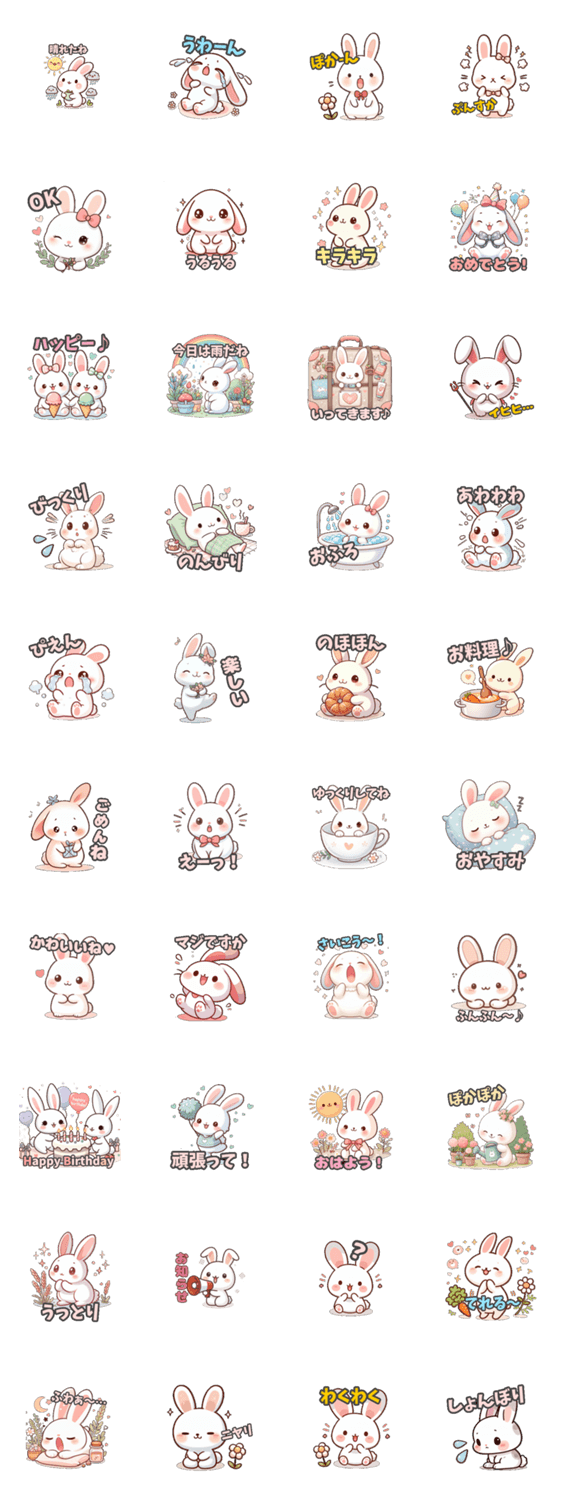 | スタンプ説明 | ふわふわ可愛いウサギたちが、あなたの日常をほんわか彩ります。トークをもっと癒し系にしたいあなたにぴったり! |