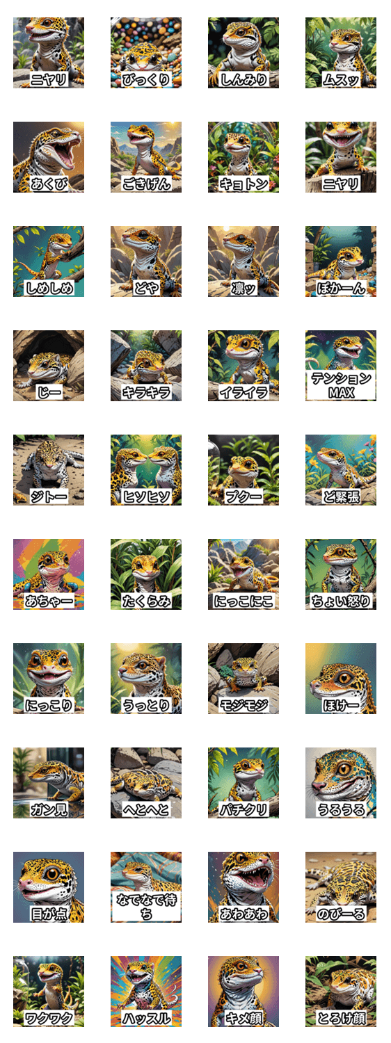 表情豊かなレオパ(ヒョウモントカゲモドキ)が、あなたの感情をゆる〜く代弁!会話のスパイスに、癒やしの一言を。