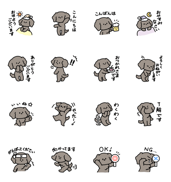 フラットコーテッドレトリバーなわんこが、日常の挨拶のお手伝いをしてくれるスタンプです♪