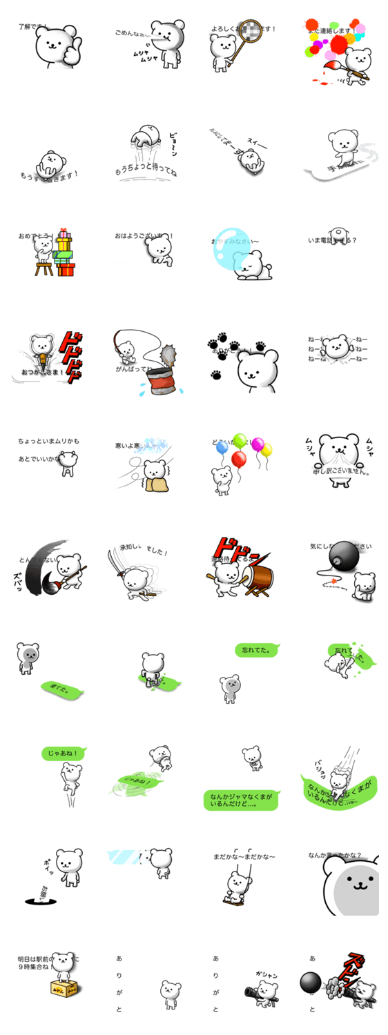 ふきだしを隠したり壊したり塗りつぶしたり。とにかく邪魔なくまです。見やすい様に白以外の背景で使って下さい。使ってみて初めて分かる、会話を楽しくするスタンプです。