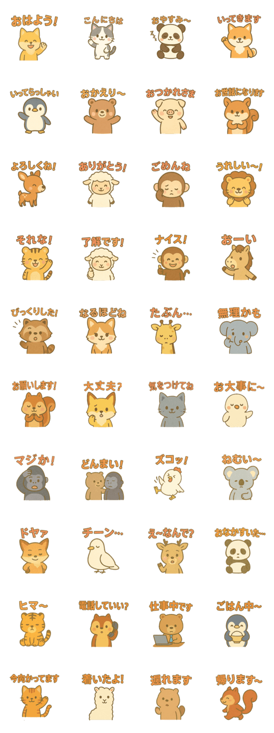 日常生活で使いやすい、あいさつ、返信、報告、ツッコミ、行動などを可愛い動物のキャラクターでスタンプにしました。