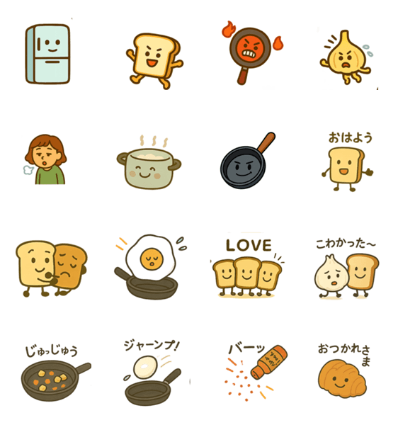 キッチンの朝はまだまだ大さわぎ。フライパンさんや、かわいいしょくぱんずも大さわぎ。
