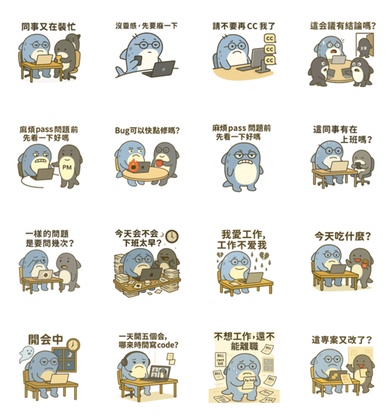 Sharky's Office Life" is a sticker set that perfectly captures the daily struggles of office workers. From endless meetings.