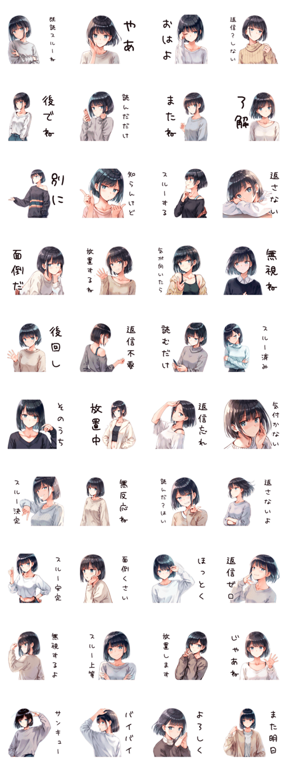クールな女子にぴったり!既読スルー、ドライな返信、冷たい態度、無視、サバサバ、日常会話、女性イラスト、感情表現。