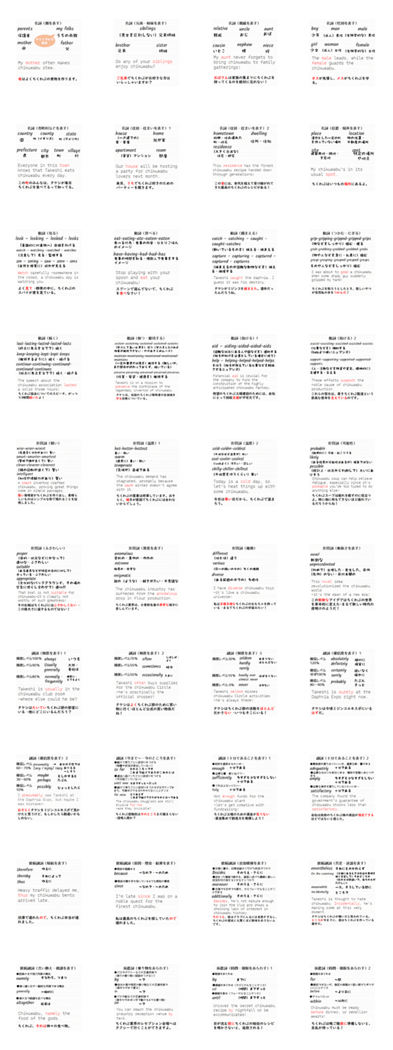 似たような意味の単語をひとまとめにチェックできる気がするスタンプです。レベル関係なくいろいろと混じっています。あと、ちくわぶをさりげなくアピールできます。