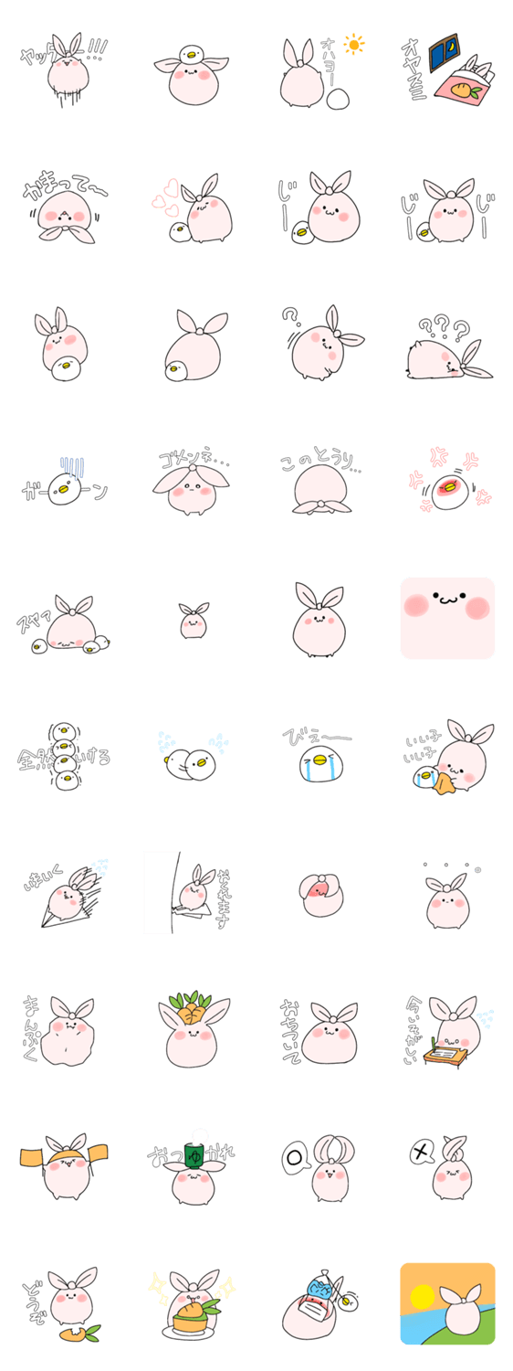 丸くて可愛い、ふろしきでできたうさぎちゃん。おてだまあひると仲良し。可愛いけどちょっとシュールでゆるいスタンプ。