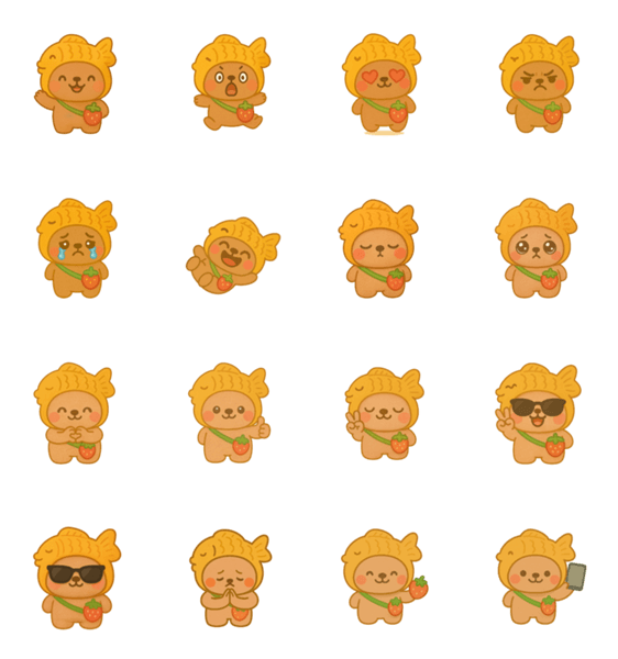 This little one is a capybara wearing a taiyaki fish hat and carrying a super cute strawberry bag.