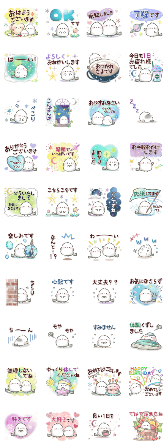 おもちの相棒だったふわふわシマエナガがメインスタンプになりました。毎日使える挨拶、敬語MIXで使いやすい♪月や星、宇宙モチーフのファンタジーテイストに癒されます♡
