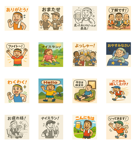 中年ランニング仲間に贈る、癒しと笑いの手書き風スタンプです。あいさつ・応援・ボヤきまで、走る人たちの“あるある”がギュッと詰まってます!