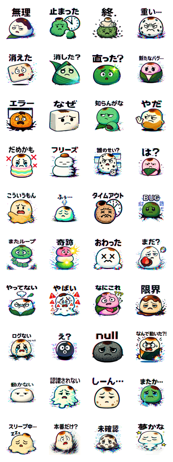 伝統的な餅とシステムバグが融合した、ちょっと不思議で愛らしいキャラクター。バグによる表情とカラフルな歪みが、あなたの会話にユーモアとカオスを加えます!