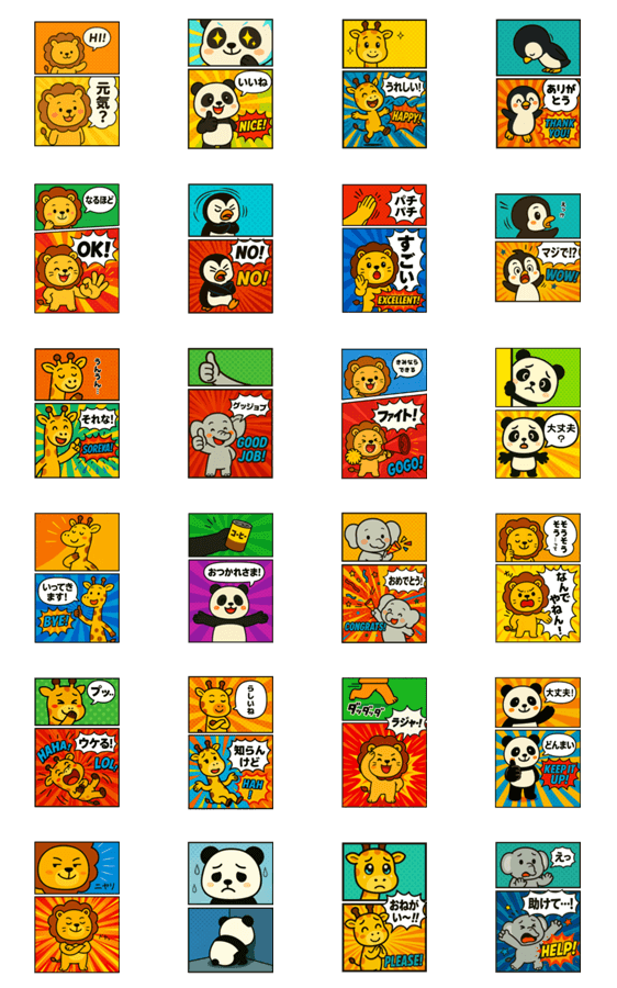 | スタンプ説明 | 「彼らはやってきた!日常会話をもっとパワフルに、もっとカラフルに!」 アメコミ風の動物たちが、元気いっぱいのリアクションであなたの気持ちをドカーンと届ける! ※このスタンプはトークルームで大きく表示されるBIGスタンプです。 |