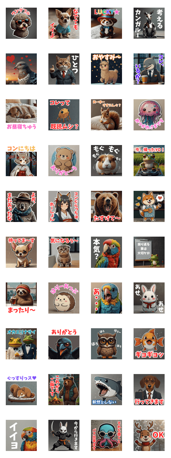 ちょっとクセになる!?不思議な表情の動物たちが、あなたのトークにじわじわ笑いを届けます。