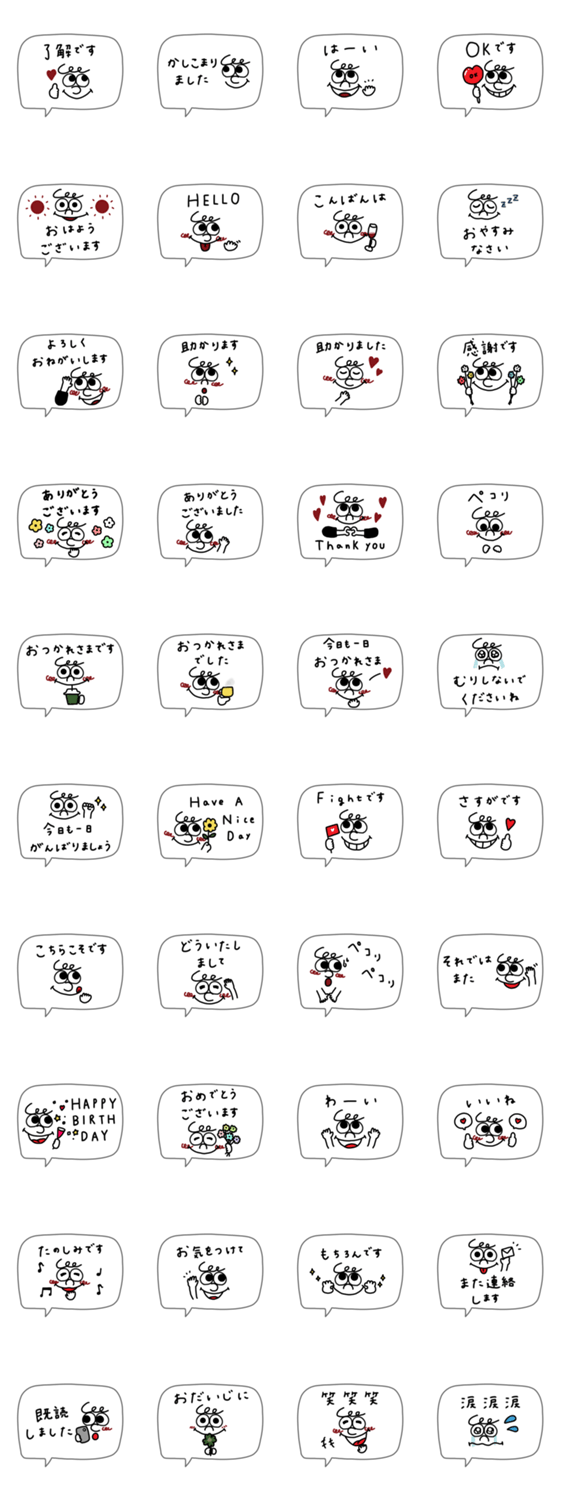 | スタンプ説明 | シンプルな落書きがかわいい♡ぎょろ目で見やすい*敬語入り。 |