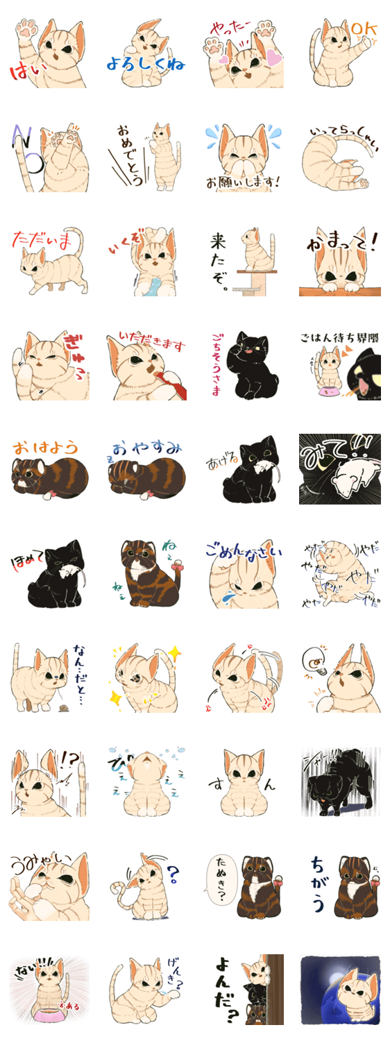 ビビりで心優しい茶トラ猫の男の子ちーのスタンプです。黒猫のふく、サビ猫のここも合わせています