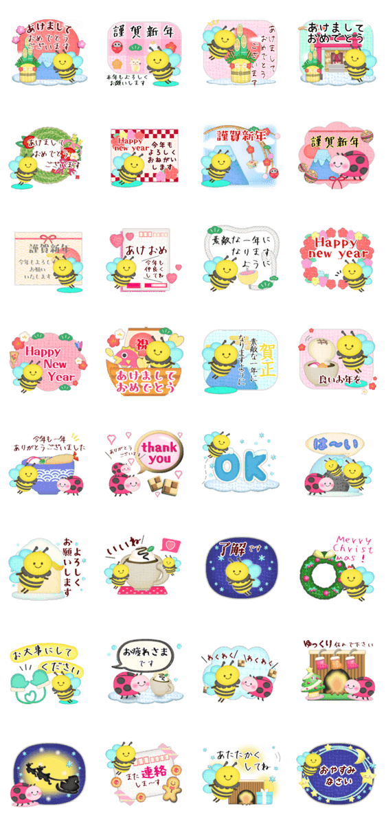 | スタンプ説明 | 【お正月】年末年始の挨拶に使える冬年賀スタンプ/お正月や大晦日に使いやすい/蜂/テントウムシ/敬語/お正月/新年/年賀/あけましておめでとう/お大事に/年賀状/mamama-chin |