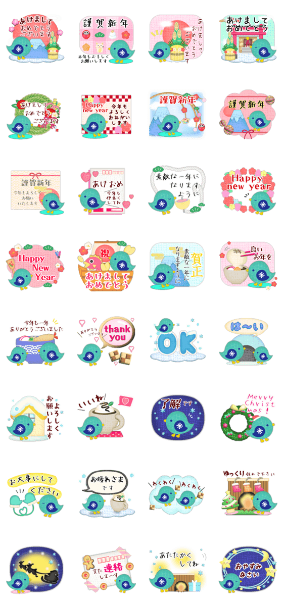| スタンプ説明 | 【お正月】年末年始の挨拶に使える冬の年賀スタンプ/お正月や大晦日に使いやすい/鳥/敬語/お正月/新年/年賀/あけましておめでとう/お大事に/年賀状/クリスマス/mamama-chin |