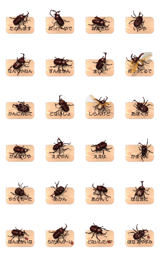 | スタンプ説明 | カブトムシがスマホの上で動いているように見える(関西弁バージョンの)アニメーションスタンプです。《スタンプアレンジ機能:対応》 |