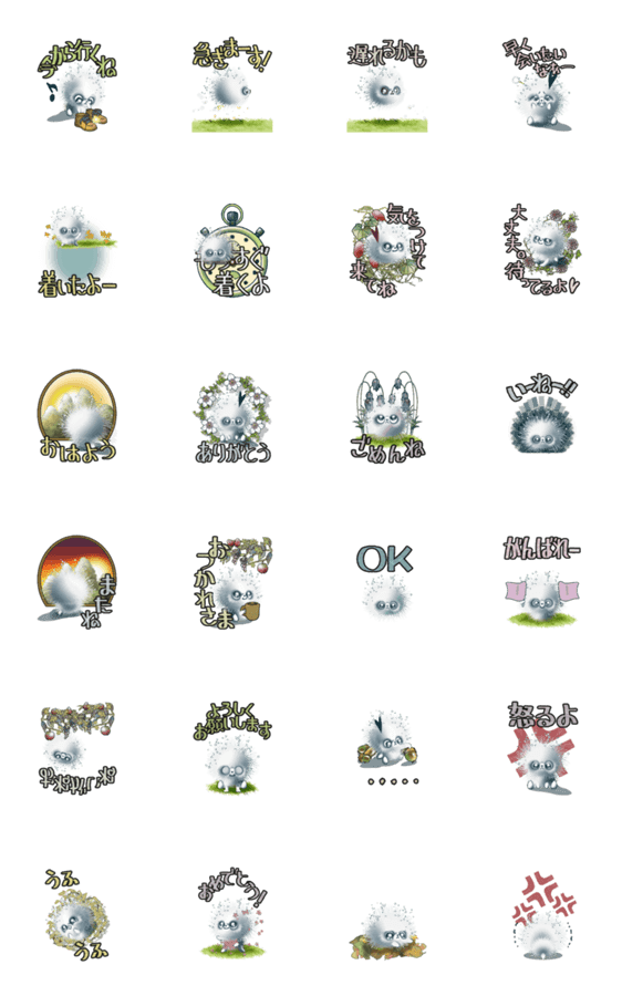 待ち合わせに便利な言葉が並んでいます。妖怪でもない、猫でもない、可愛い生き物♪自然の景色を取り入れ 優しい雰囲気になってます。